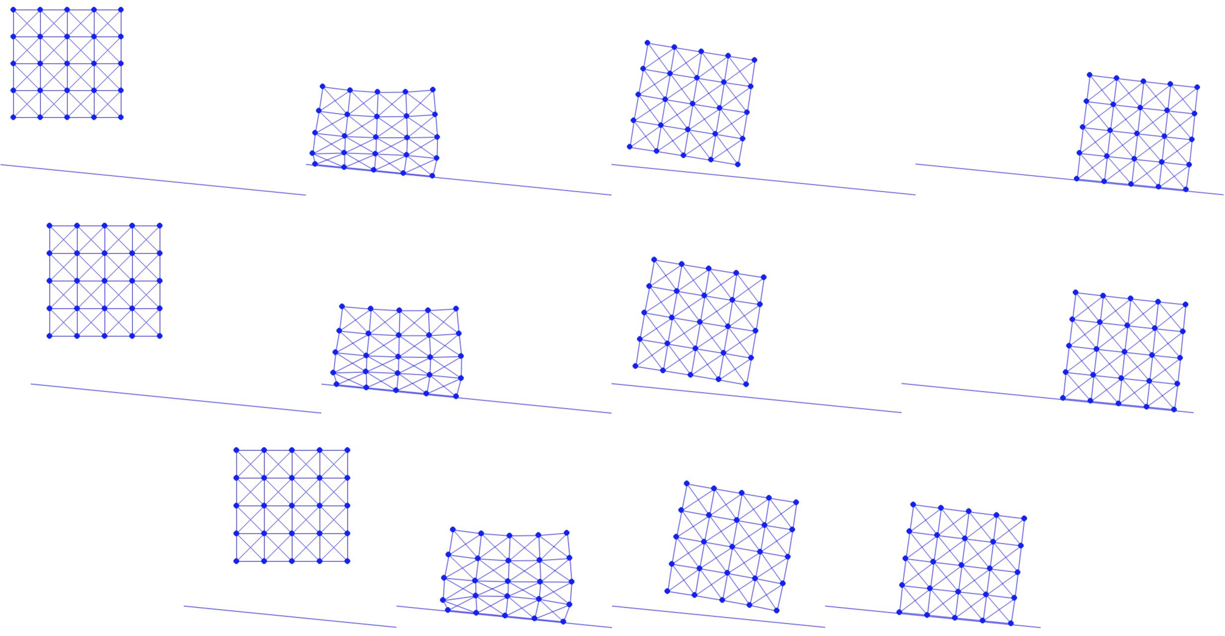 Now we are ready to test the simulation with different friction coefficients. Since our slope has an inclined angle with , we test , , and (Figure 10.2.1). Here we see that when , the critical value that provides dynamic friction forces in the same magnitude with that of the gravity component on the slope, the square keeps sliding after gaining the initial momentum (Figure 10.2.1 top). When we set , right above the critical value, the square slides a while and then stopped, showing that static friction is properly resolved (Figure 10.2.1 middle). With , the square stops even earlier (Figure 10.2.1 bottom).