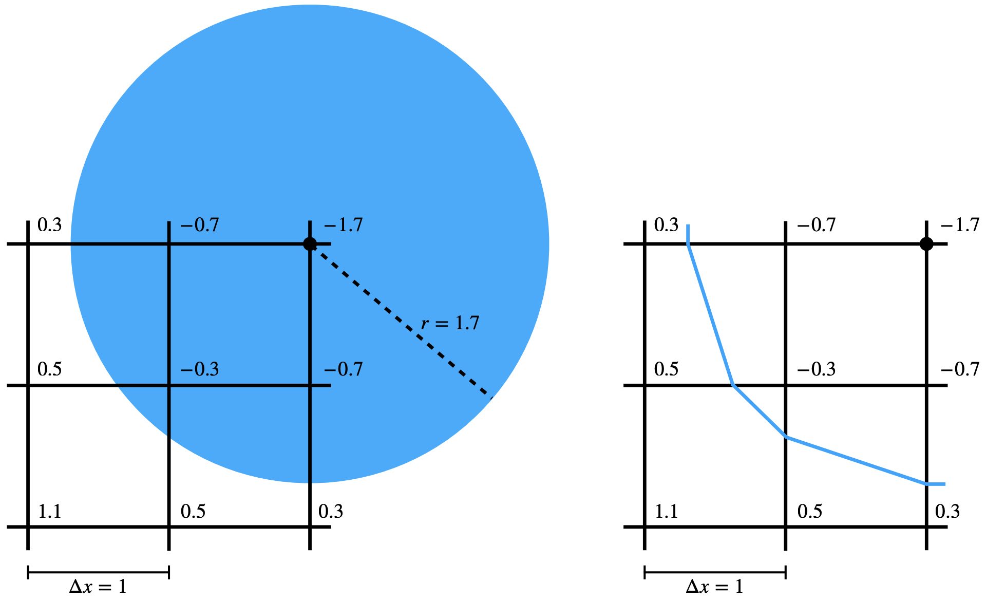Figure 7.1.1. The signed distance between the grid nodes and the sphere boundary is precomputed and stored (left). With bilinear interpolation, part of the sphere boundary is approximated as the blue polyline (right).