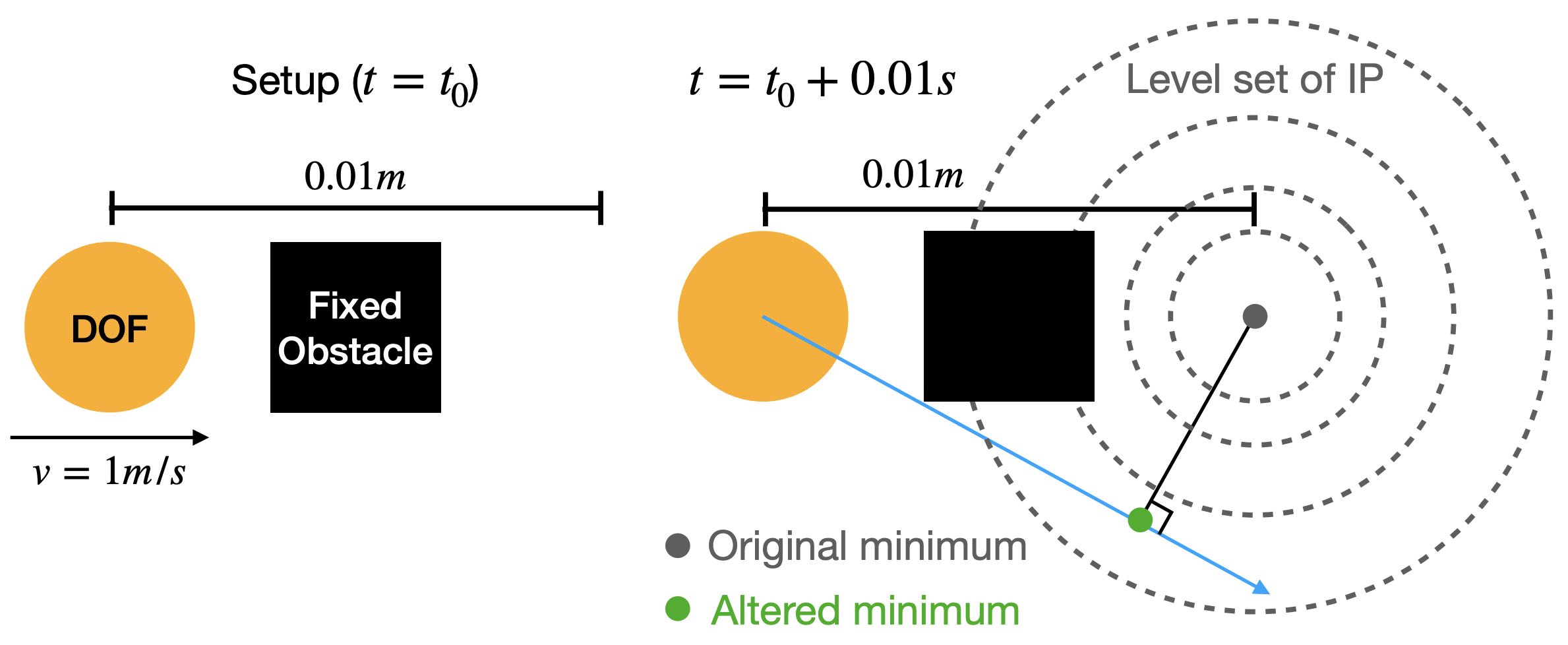 The most straightforward way of defining the motion trajectory between \(x^n\) and \(x^{n+1}\) at time \(t^n\) and \(t^{n+1}\) respectively would be the high-dimensional line segment connecting these two configurations. However, although enforcing non-negative signed distances on this trajectory could avoid the tunneling issue in Example 8.1.1, this strategy could potentially result in unrealistic behaviors as it alters the local optimum of the minimization problem (Equation (7.2.1)) in a nonphysical way (Figure 8.2.1).