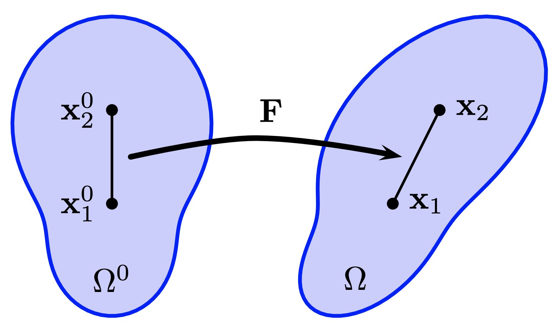 Example 12.2.1. Intuitively, the deformation gradient indicates the extent of local deformation within a material. Consider two nearby points, and , embedded in the material at the start of the simulation (as illustrated in Figure 12.2.1). If and represent these points in the current configuration, the relationship between these points can be expressed as: This equation shows how the deformation gradient transforms the initial distance between the points into their current separation, thus quantifying the local deformation.