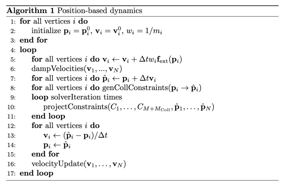 The simulation proceeds in discrete time steps of size . The central loop of the PBD algorithm can be described as follows.