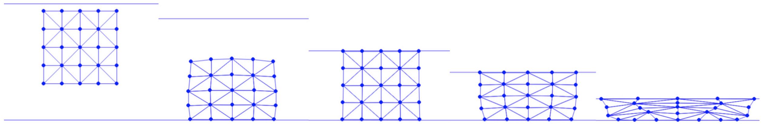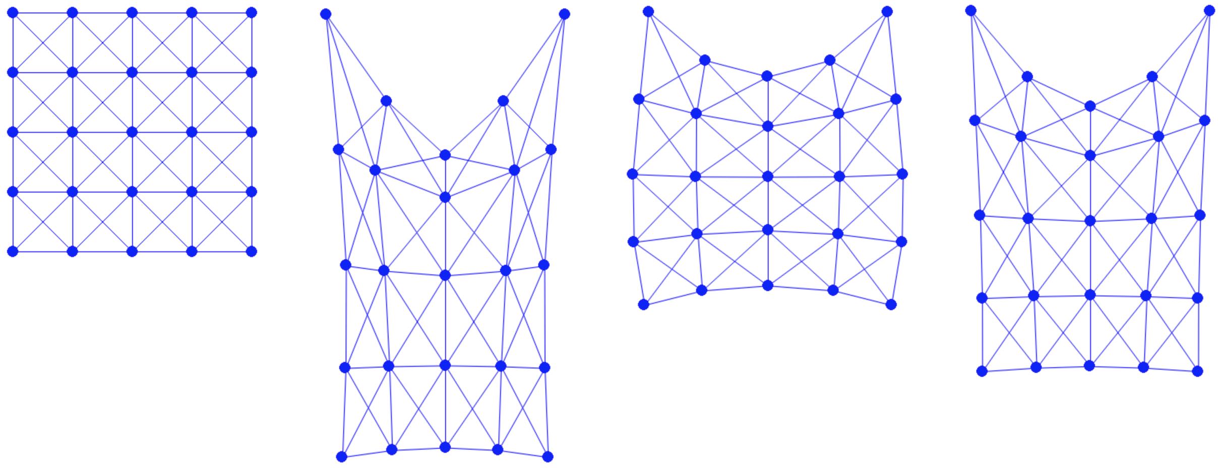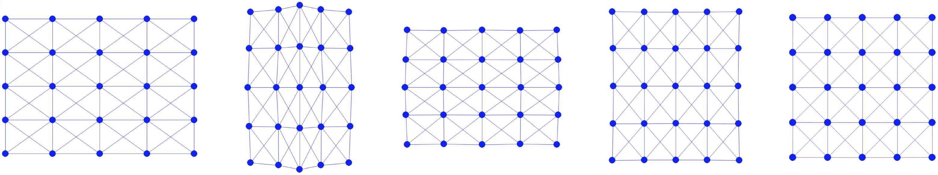 The method of creating a mesh by directly connecting points with edges or triangles is a popular technique in computational geometry. This concept is illustrated in the accompanying figure, where the left and middle images show two different meshes. Notably, even though these meshes utilize the same sampled points or nodes, they have distinct connectivities, resulting in different shapes. The rightmost mesh in the figure demonstrates a transformation from one shape to another. This mesh represents a deformation of the middle mesh, achieved by vertically compressing its upper half.