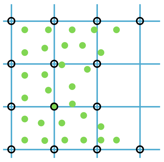 By implementing a uniform grid structure in our spatial representation, we record the extent of solid matter at each node location. This allows us to use our sampled points to calculate the density of the solid at each grid node. This method is beneficial for quantifying the solid's distribution within the grid and for establishing a network of connectivity among the original sampled points. Refer to the accompanying figure for a visual demonstration of this concept. In the figure, the sampled points are depicted as green dots. The grid nodes, where we record solid densities, are shown as black circles. These nodes are connected through the grid, illustrated with blue lines.