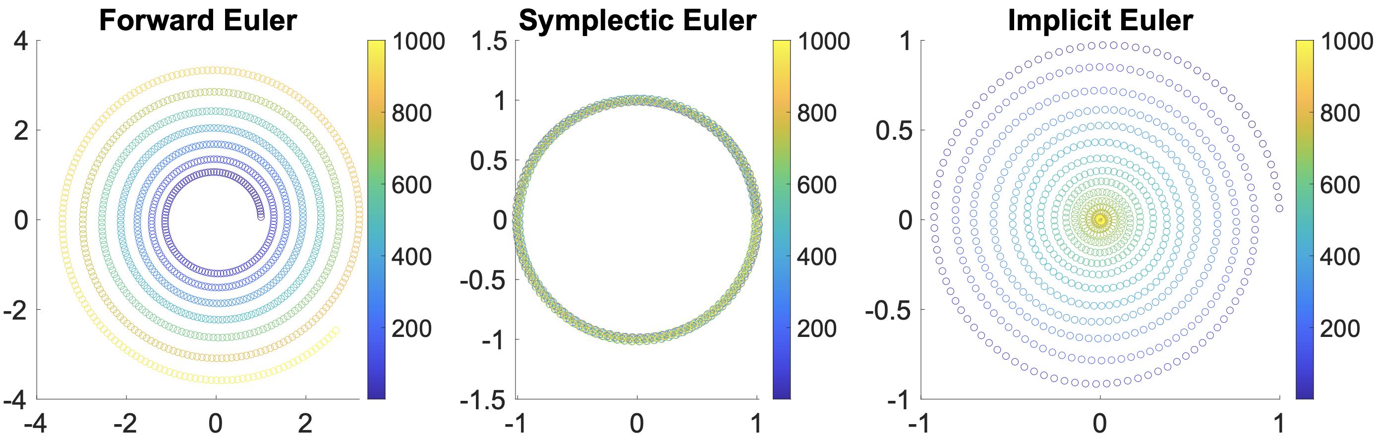 Figure 1.4.1 (Stability of Time Integrators). The provided illustration showcases a particle executing constant circular motion, simulated using the forward Euler, Symplectic Euler, and implicit Euler methods, respectively from left to right. The varying colors within the illustration represent the progression of time. Notably, each method exhibits distinct characteristics in the simulation: the forward Euler simulation eventually undergoes an unstable escalation, the Symplectic Euler closely adheres to the theoretical trajectory, and the implicit Euler, while maintaining stability, gradually brings the motion to a halt.